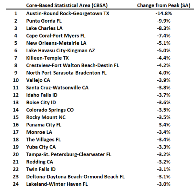 Untuk kota-kota (Area Statistik Berbasis Inti, CBSA), berikut adalah 30 kota dengan penurunan terbesar dari puncaknya, disesuaikan secara musiman. Austin terus menjadi kota dengan kinerja terburuk. Namun, 11 dari 30 kota dengan kinerja terburuk kini berada di Florida!