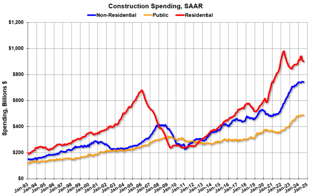 Grafik ini menunjukkan pengeluaran konstruksi perumahan dan non-perumahan swasta, serta belanja pemerintah, sejak tahun 1993. Catatan: nominal dolar, tidak disesuaikan dengan inflasi.