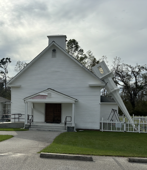 Setidaknya setengah lusin menara gereja pedesaan tergeletak di tanah. Dua foto terlampir. Yaitu tiang listrik yang roboh di depan batu bata Gereja Baptis Beulah. Saya melangkah hati-hati mengitari kabel di tanah. Kalikan dengan 1000 untuk mendapatkan efek penuh. Tidak mungkin berhenti di tempat terburuk untuk mengambil gambar karena bahu jalan tertutup dahan dan batang kayu yang telah disingkirkan dari jalan. Rumah dogtrot favorit saya di rute ini masih utuh, dengan dinding kayu cemara dan atap logam baru.