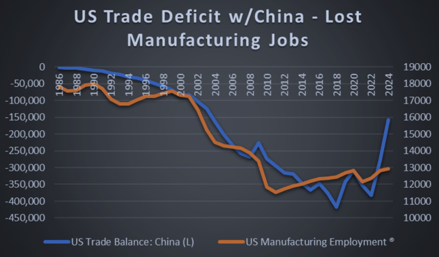Graph: China was admitted to the WTO in late 2001. From that point forward manufacturing employment in the US fell in lock-step with the US Trade Balance with China. China was allowed to flood the US with low-priced consumer goods as part of its export-led growth strategy. Doing so made economic sense for China, but not for the Americans. The ‘temporary’ strategy by China was allowed to permanently displace US-based manufacturing. Units (L) USD, thousands, (R) persons, thousands, Source: St. Louis Federal Reserve, Census Bureau.