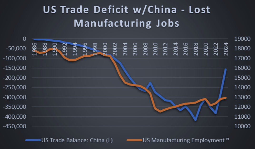 In China, a large number of newly employed Chinese workers were lifted out of poverty by the policy. From China’s perspective, as well as from that of development economists, the export-led growth strategy 1) materially benefited a significant number of Chinese workers, and 2) supported the development economics that had been deployed by China to do so. Missing from the policy analysis was the loss of manufacturing jobs in the US. The workers in the US who lost jobs from the policy were not rich, even though rebalancing from rich to poor is part of the motivating logic of the policy.