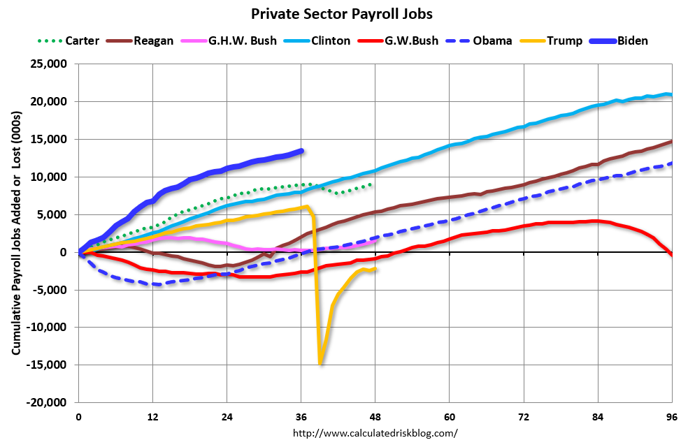 Pekerjaan sektor swasta meningkat sebesar 9,039,000 di bawah Presiden Carter (garis putus-putus hijau), sebesar 14,714,000 di bawah Presiden Reagan (merah tua), 1,507,000 di bawah Presiden GHW Bush (ungu muda), 20,970,000 di bawah Presiden Clinton (biru muda), hilang 377,000 di bawah Presiden GW Bush, dan memperoleh 11.833.000 di bawah Presiden Obama (biru putus-putus tua). Selama masa jabatan Trump (Oranye), perekonomian kehilangan 2.135.000 pekerjaan di sektor swasta.