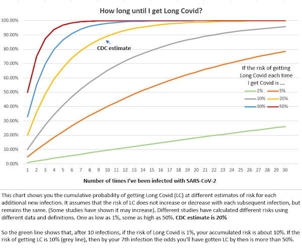 This handy chart from Sloan Kettering gives a visual represenation of the odds of getting Long Covid with repeated infections: