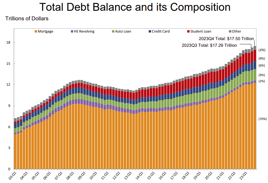 Saldo utang rumah tangga agregat meningkat sebesar $212 miliar pada kuartal keempat tahun 2023, naik 1,2% dari kuartal ketiga tahun 2023. Saldo sekarang mencapai $17,50 triliun dan telah meningkat sebesar $3,4 triliun sejak akhir tahun 2019, tepat sebelum resesi pandemi.