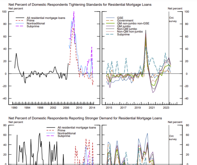 Untuk pinjaman rumah tangga, bank, secara keseluruhan, melaporkan bahwa standar pinjaman diperketat di semua kategori pinjaman real estat residensial (RRE) selain hipotek perumahan pemerintah dan hipotek perumahan yang memenuhi syarat untuk perusahaan yang disponsori pemerintah (GSE), yang pada dasarnya standarnya tetap tidak berubah. . Sementara itu, permintaan melemah untuk semua kategori pinjaman RRE. Selain itu, bank-bank melaporkan standar yang lebih ketat dan permintaan yang lebih lemah terhadap jalur kredit ekuitas rumah (HELOCs). Selain itu, untuk kartu kredit, mobil, dan pinjaman konsumen lainnya, standarnya dilaporkan semakin ketat, dan permintaan terhadap keseimbangan melemah.