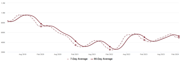 Altos melaporkan bahwa inventaris keluarga tunggal yang aktif turun 0,5% dari minggu ke minggu. Saya memperkirakan inventaris akan mencapai titik terendah pada bulan Februari tahun ini, dibandingkan pada pertengahan April pada tahun 2023.