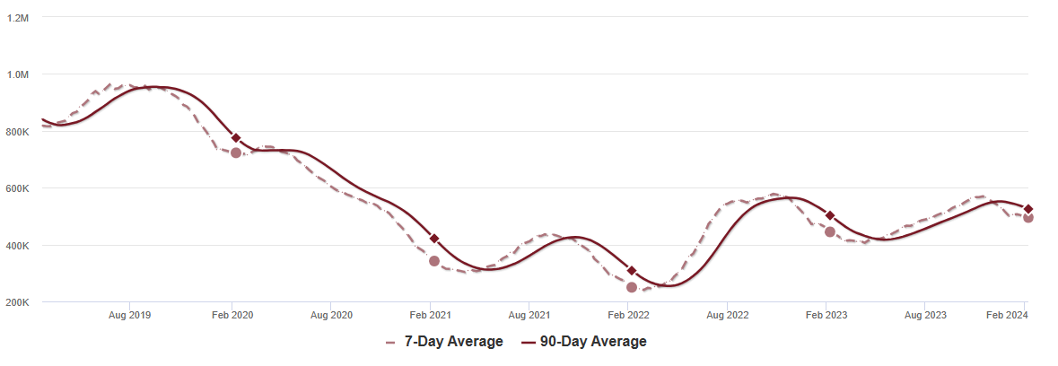 Garis merah untuk tahun 2024. Garis hitam untuk tahun 2019. Perhatikan bahwa inventaris naik 99% dari rekor terendah pada minggu yang sama di tahun 2022, namun masih jauh di bawah level normal.