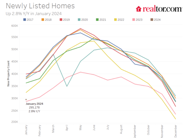 Memberikan dorongan pada inventaris secara keseluruhan, jumlah penjual meningkat pada bulan Januari ini karena rumah yang baru dicatatkan berada 2,8% di atas level tahun lalu. Hal ini menandai peningkatan aktivitas listing pada bulan ketiga setelah penurunan berturut-turut selama 17 bulan, namun peningkatan bulan ini lebih rendah dibandingkan tingkat pertumbuhan bulan lalu sebesar 9,1%. Perhatikan musim untuk listingan baru. Desember dan Januari secara musiman merupakan bulan-bulan terlemah dalam setahun untuk pencatatan saham baru. Tampaknya sangat mungkin bahwa listing baru akan meningkat dari tahun ke tahun pada tahun 2024, namun kita harus menunggu data bulan Maret untuk melihat seberapa dekat listing baru dengan level normal. Masih banyak lagi yang bisa dilihat di artikel ini.